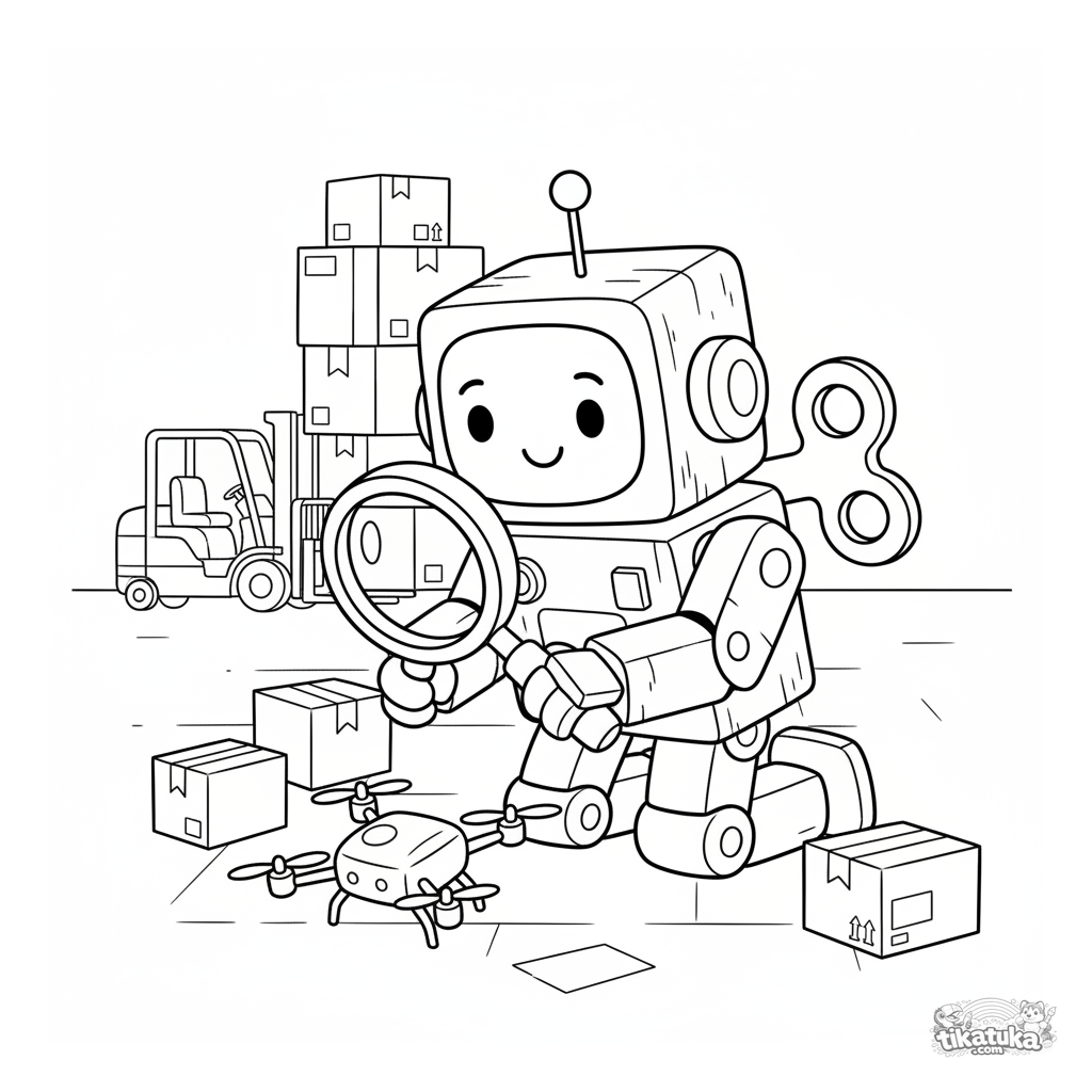 Coloring page for kids 4-6: a toy robot with a wind-up key in a warehouse among boxes carefully studies a small drone with a magnifying glass.