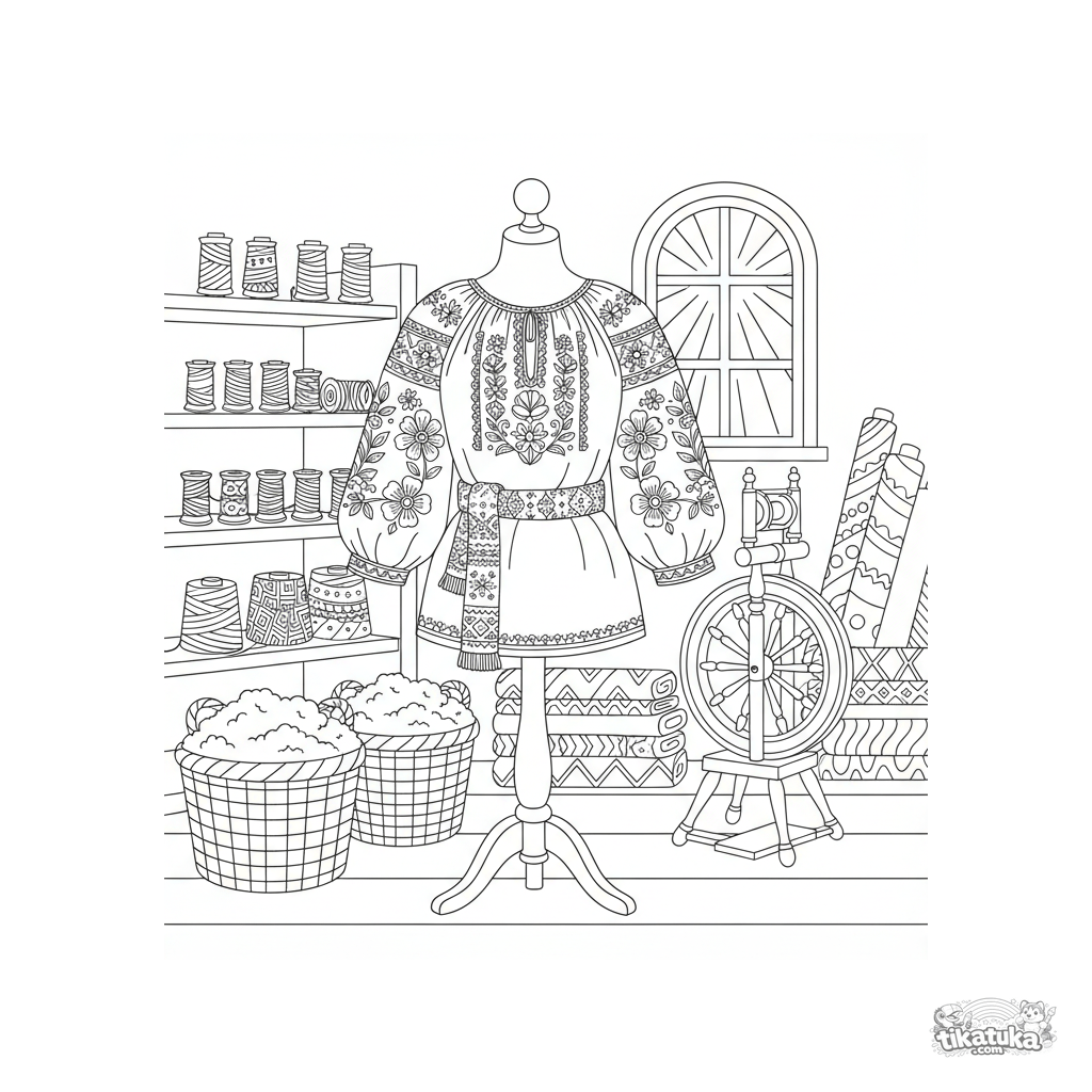 Detailed coloring page for ages 10-12: a traditional embroidered blouse on a mannequin in a village textile workshop, with shelves of thread, yarn, and fabric bolts.