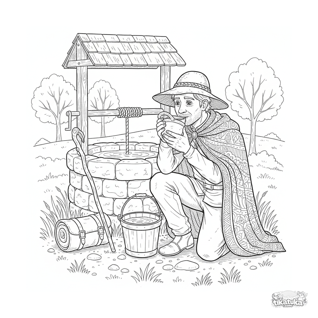 Complex coloring page for older kids 10-12: a weary traveler quenches his thirst from the living water well. Detailed field-guide style with precise outlines.