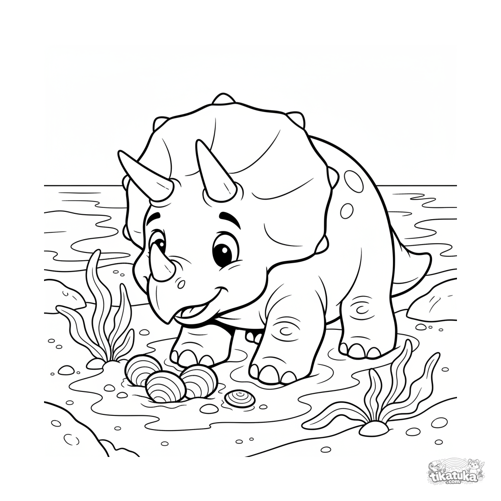 Coloring page for tweens 7-9: a three-horned triceratops with a large frill digs patiently in the wet sand of an ancient ocean shoreline, discovering clamshells. Expressive pose, moderate detail.