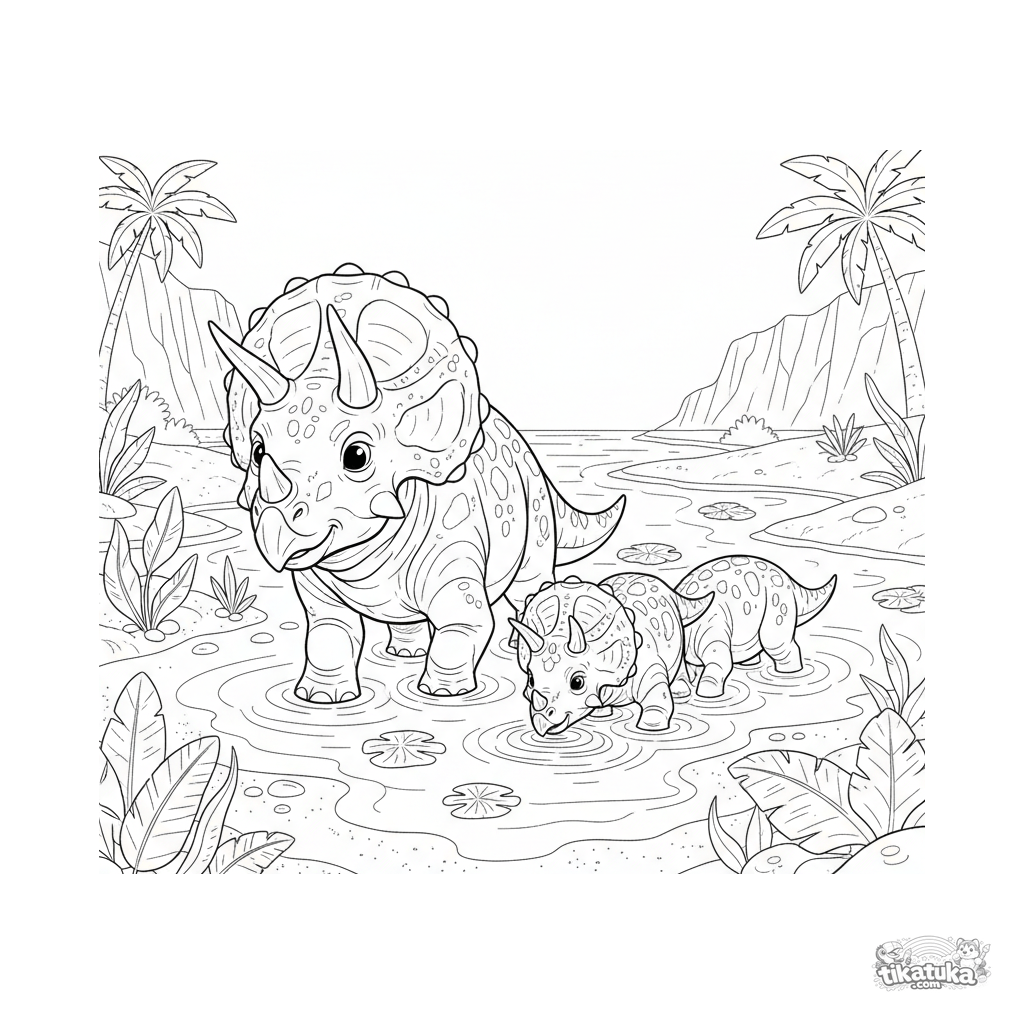 Detailed realistic coloring page of a triceratops family wading through a shallow lagoon on an ancient beach. For kids 10-12 years old. Scene with multiple characters.