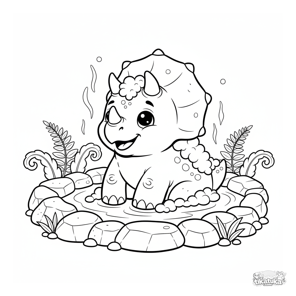 Coloring page for kids 4-6: a happy triceratops takes a foamy bath in a volcanic hot spring surrounded by ferns and smooth rocks.