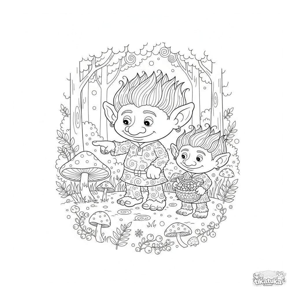 Coloring page for older kids: a family of friendly trolls gathers mushrooms and berries in a Nordic forest. A detailed scene from Scandinavian folklore.