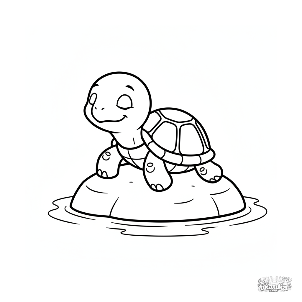Simple coloring page for toddlers 2-3: a cute, plush-toy-like turtle basking on a rock in a stream. Very simple, large shapes for coloring.
