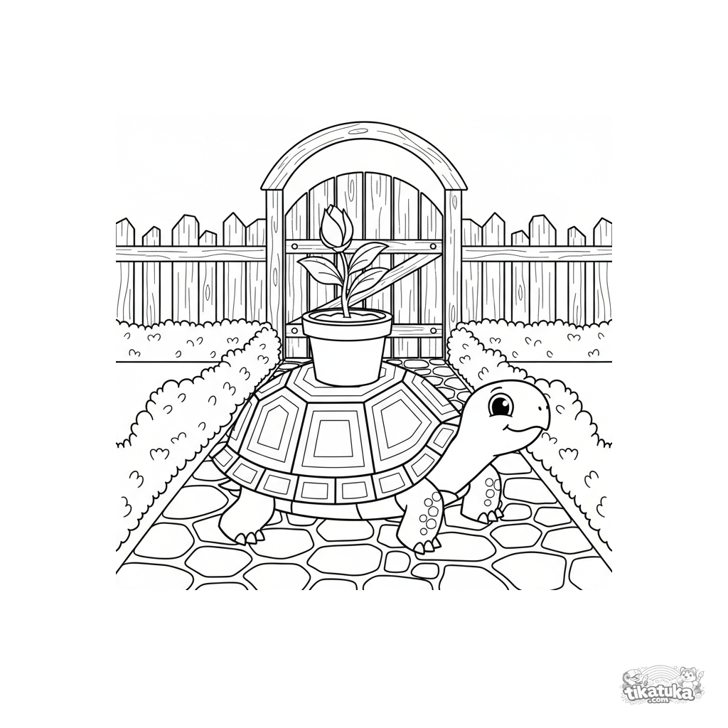 Kids coloring page: a cute turtle carries a small flowerpot along a stone path in a garden. Simple yet detailed scene with clear outlines.
