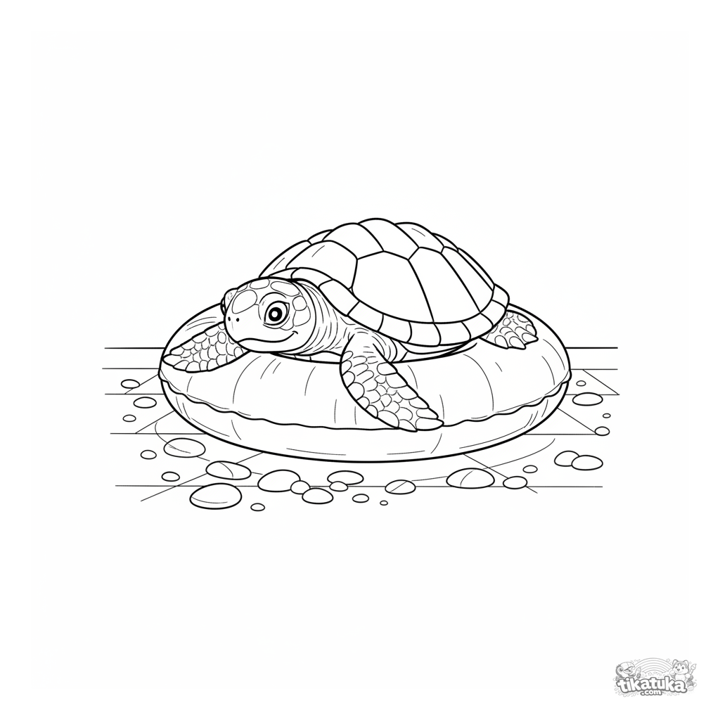 Detailed coloring page for kids 10-12: a baby turtle with a patterned shell rests on the inner ledge of an inflatable ring on the pool floor. Realistic lines.