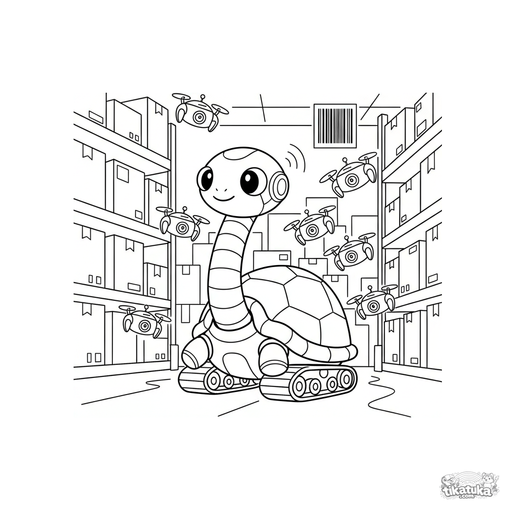 Coloring page for kids 4-6: a cute turtle robot inspecting a warehouse among boxes and drones. Print and color the inspector of the future!