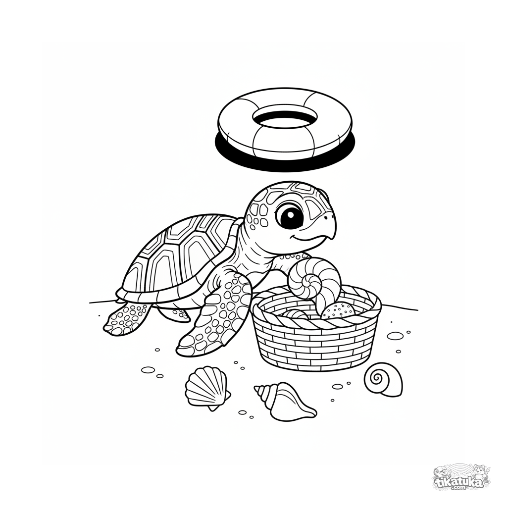 Coloring page for tweens 7-9: a baby turtle collects seashells in a basket on the pool floor under an inflatable ring. Detailed outlines and natural poses.