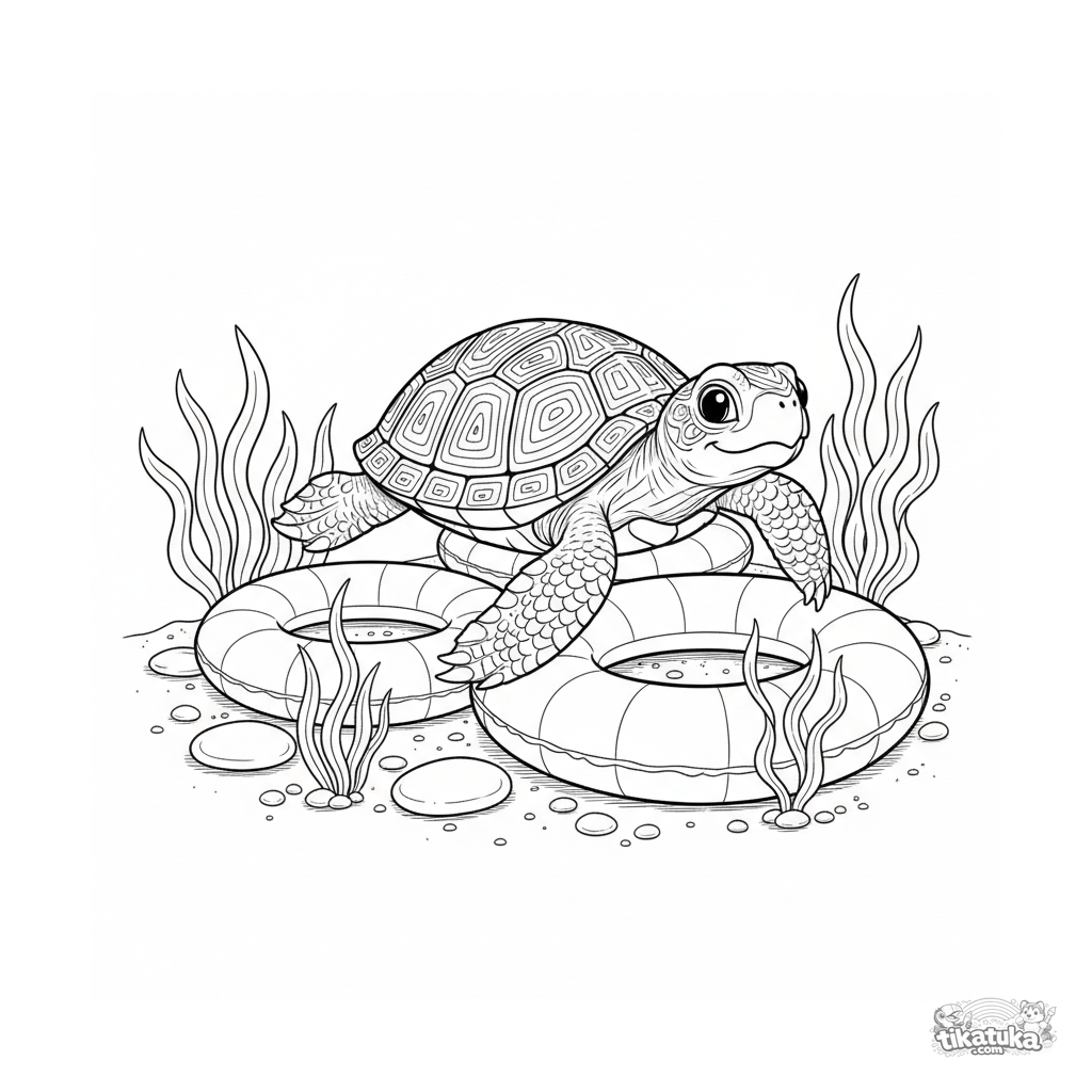 Detailed coloring page for kids 10-12: a turtle swims through inflatable rings on the pool bottom. A scene with motion and texture for engaged coloring.