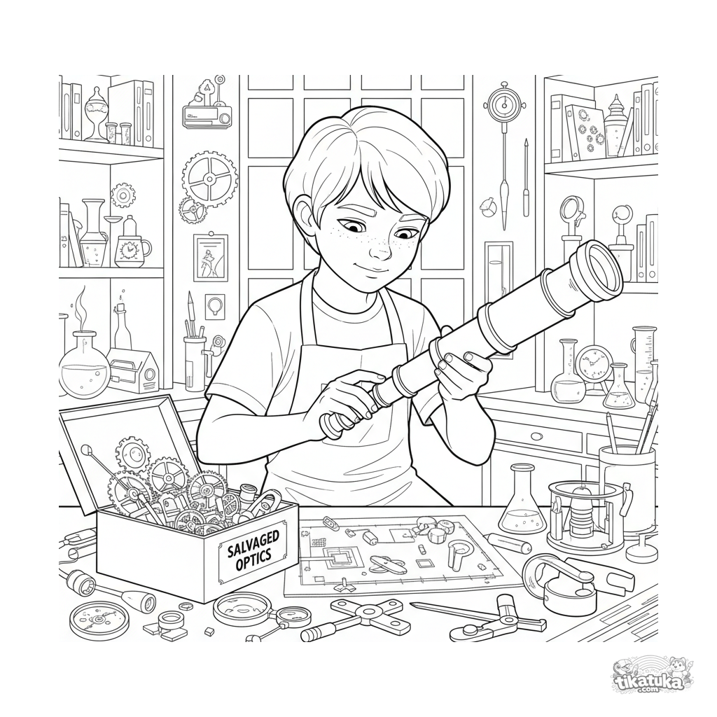 Coloring page for tweens 7-9: a boy assembles an intricate telescope from vintage lenses and brass tubing in a secret laboratory.