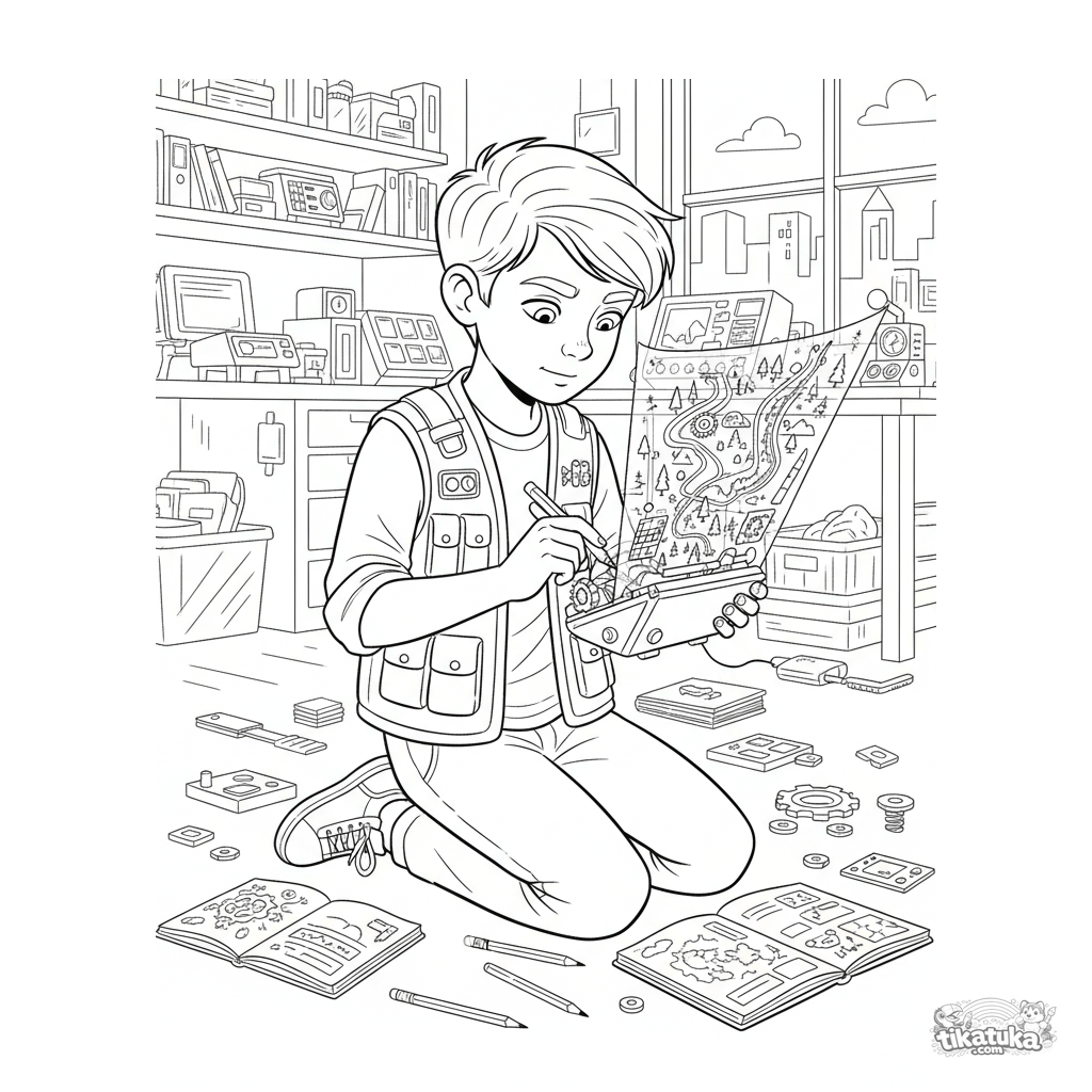 Coloring page for tweens 7-9: a young inventor repairs a holographic map projector in a secret laboratory full of parts and schematics.