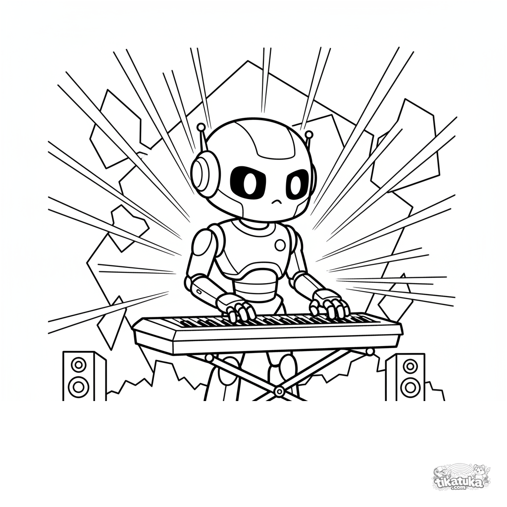 Coloring page for tweens 7-9 years: a cool robot musician playing a synthesizer on a concert stage amidst a laser light show. Dynamic lines, interesting robot body details.
