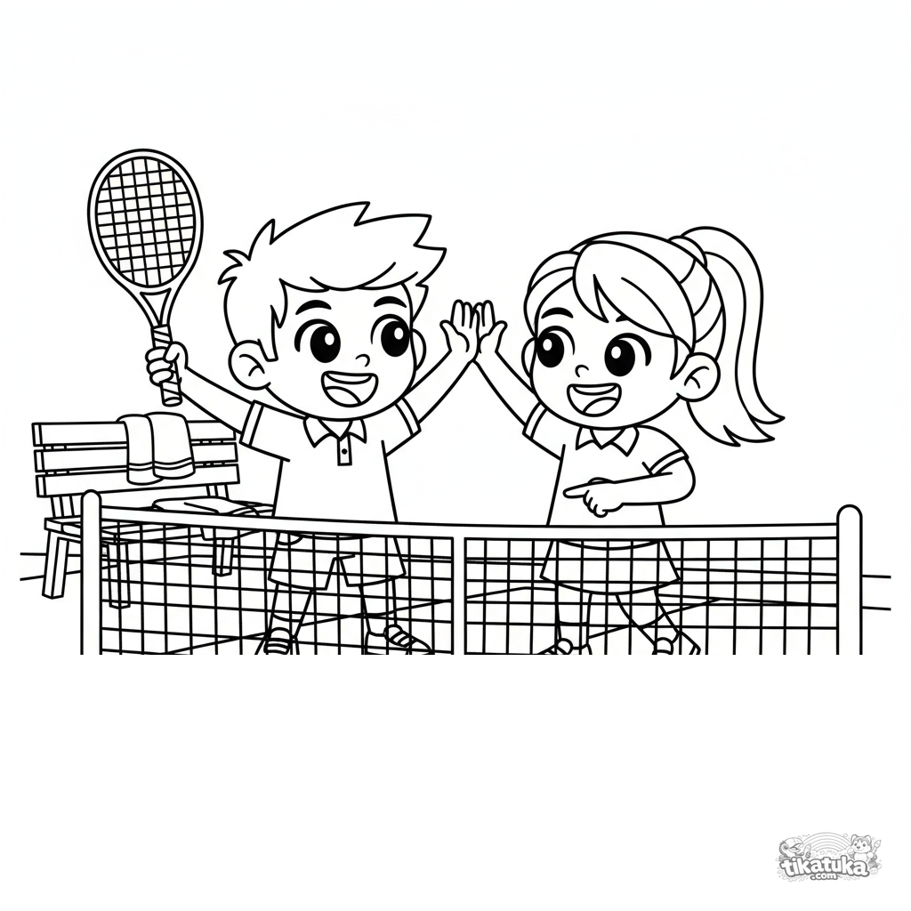 Coloring page for tweens 7-9 years: a doubles tennis match, a joyful moment celebrating a point won. Dynamic scene with two characters and court details.