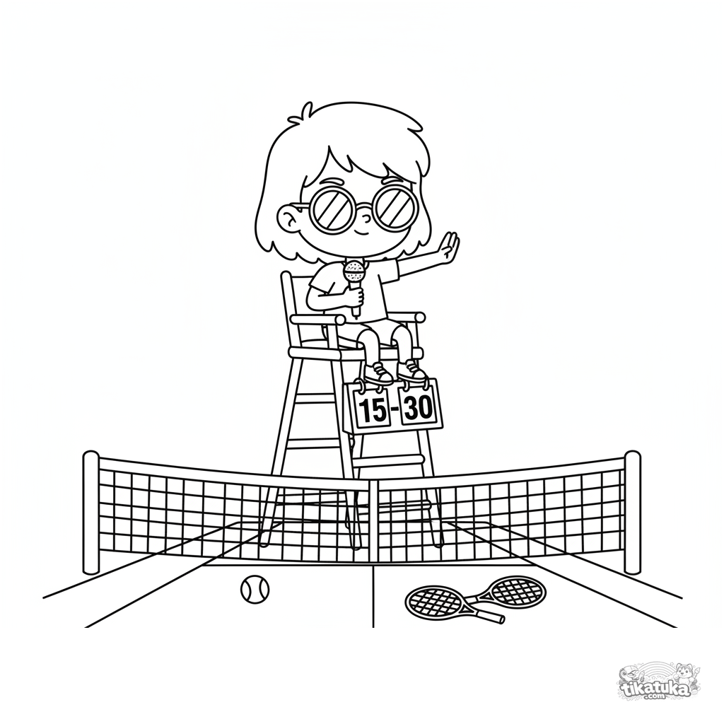 Coloring page for tweens 7-9 years: a young referee in the high tennis umpire chair making a call. Scene with microphone, scoreboard, and net.
