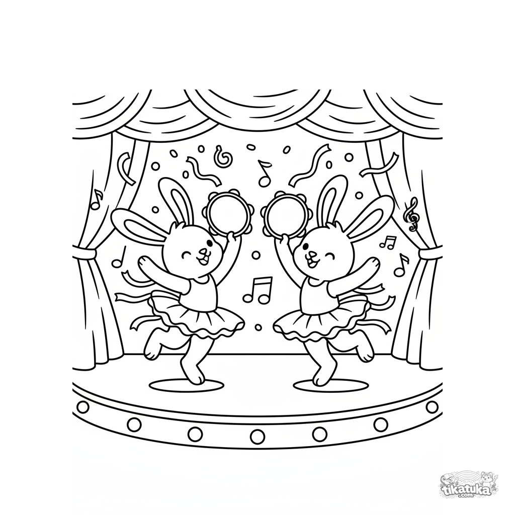 Coloring page for ages 7-9: two joyful bunny twins dance with tambourines on a concert stage. Soft puppet style, dynamic poses.