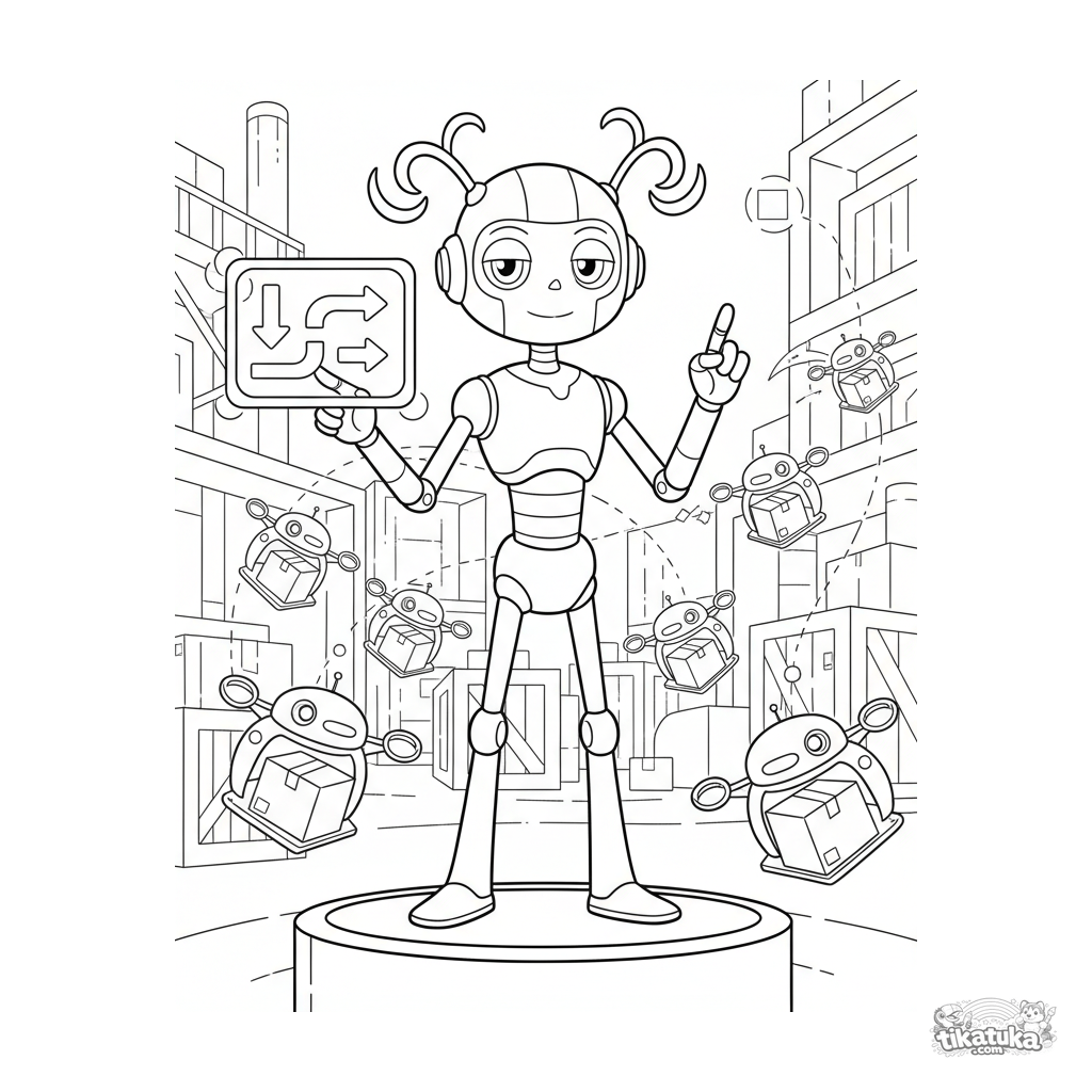 Coloring page of a robot overseer directing drones via holographic display in a warehouse. For tweens 7-9. Dynamic anime-inspired scene with lots of action.