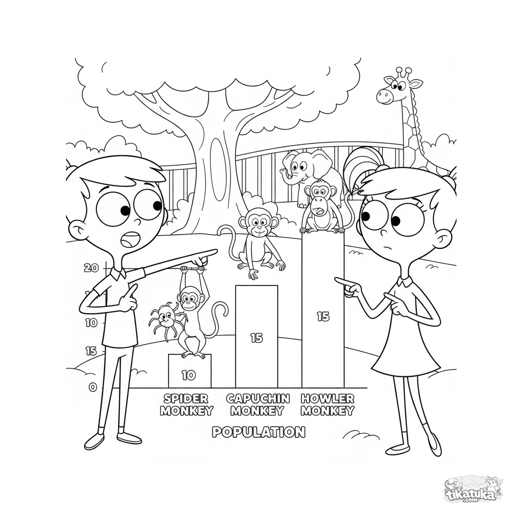 Coloring page for ages 7-9: twins study a colorful bar chart showing the population of different monkey species at the zoo. Educational scene combining math and zoology.