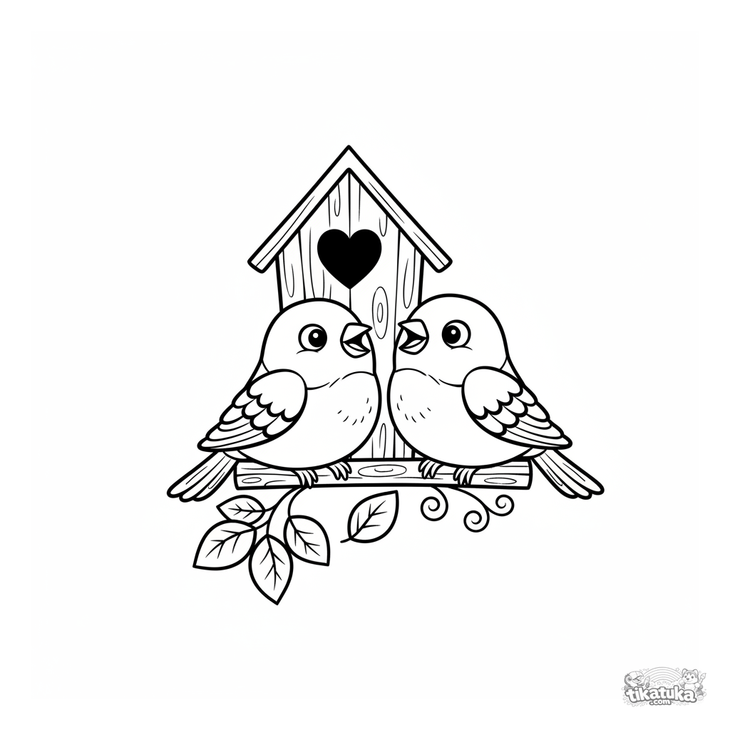 Coloring page for kids 4-6 in folk style: two finch birds sitting on a birdhouse perch, chatting. Bright decorative shapes, simple outlines.