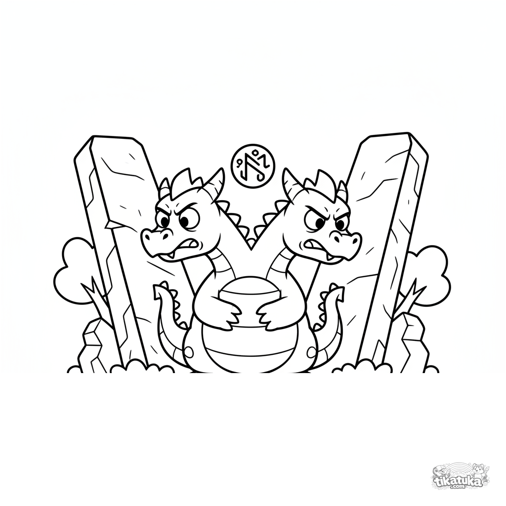 Funny coloring page: a two-headed dragon whelp argues with itself by ancient rune monoliths. For tweens 7-9 years old. Comedic scene.