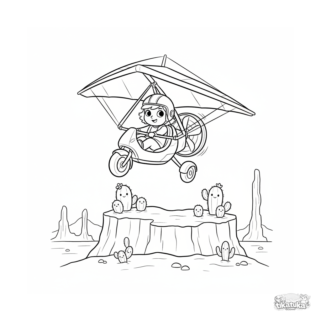 Coloring page for kids 4-6: a colorful ultralight trike with a fan propeller flies joyfully above a desert mesa dotted with cacti, its helmeted pilot leaning into the turn.