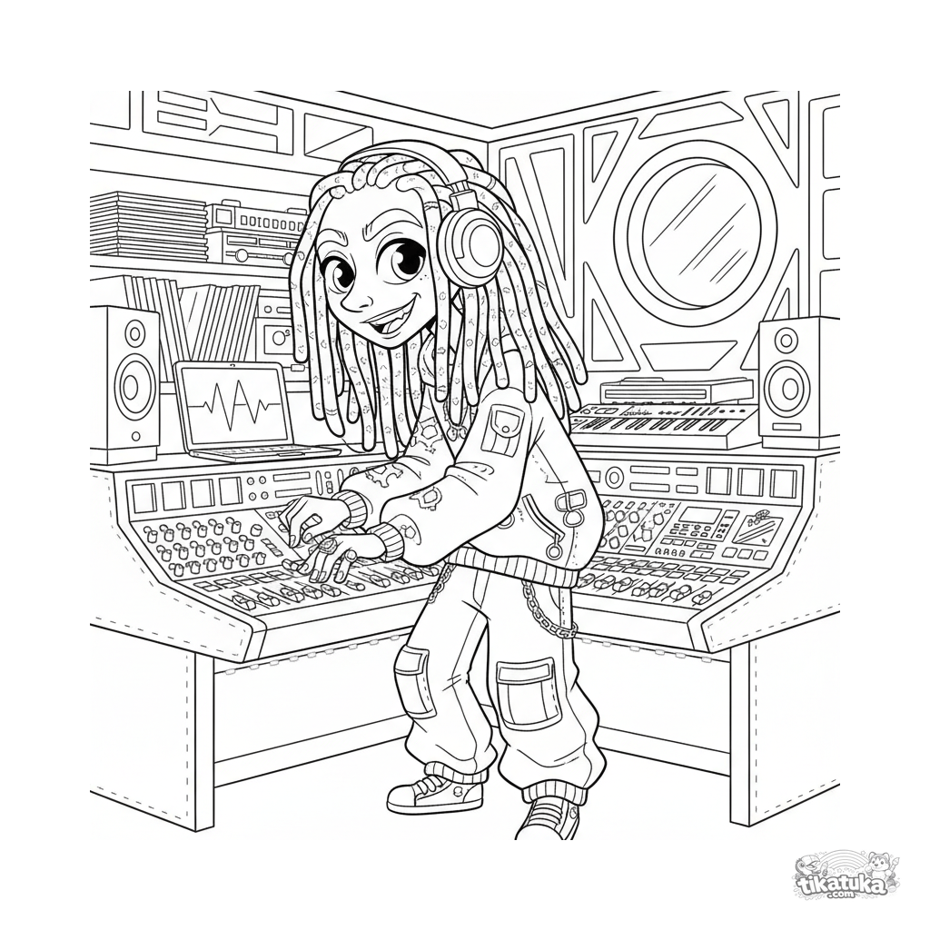 Coloring page for ages 10-12: an underground music producer at work in a basement mixing booth. Details: mixing console, headphones, vinyl records, synthesizers, and LED lights.