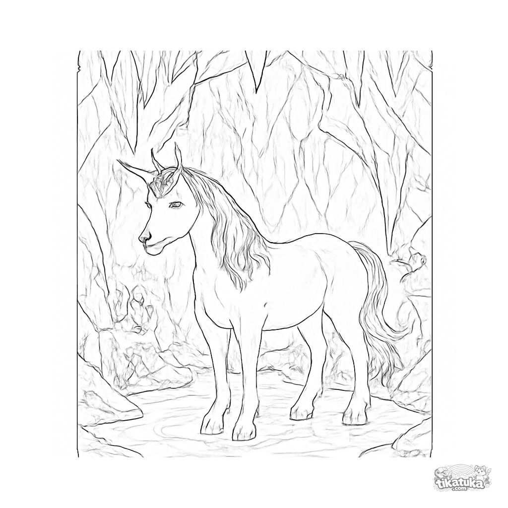 Coloring page for children 8-12 years. Silver unicorn standing in glittering blue ice crystal cave with glowing mushrooms and frozen pool. Free download.