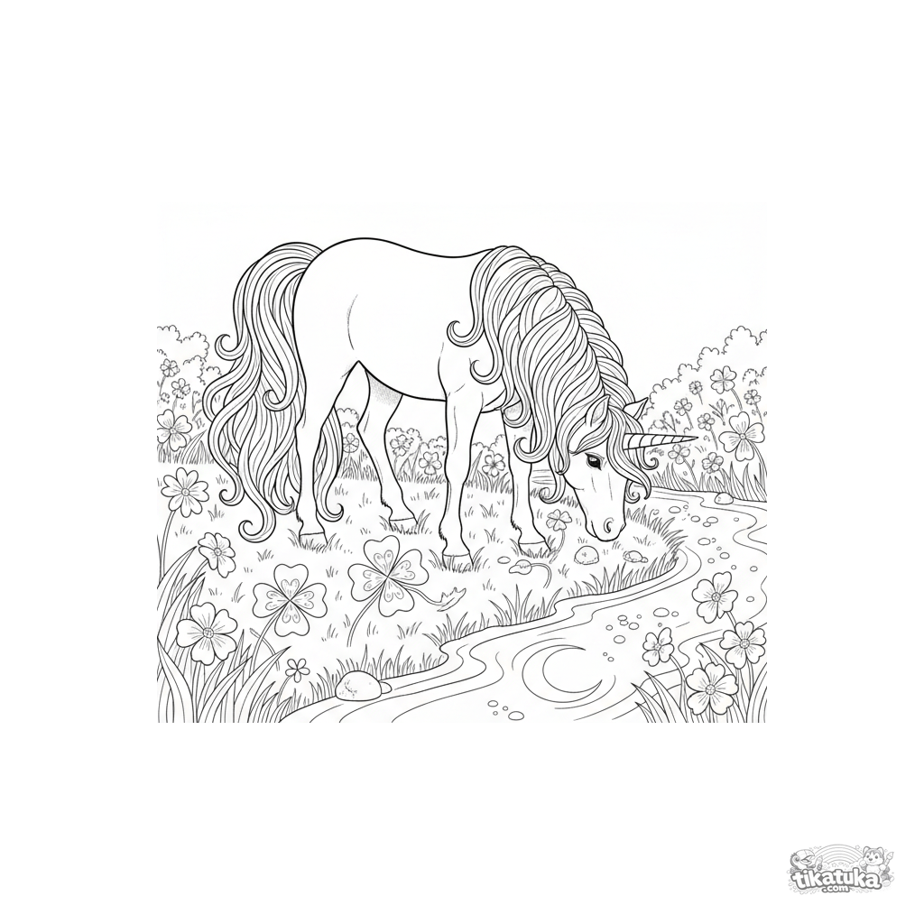 Detailed coloring page of a graceful unicorn in a moonlit meadow by a stream. For kids aged 8 and up. Realistic style for experienced colorists.