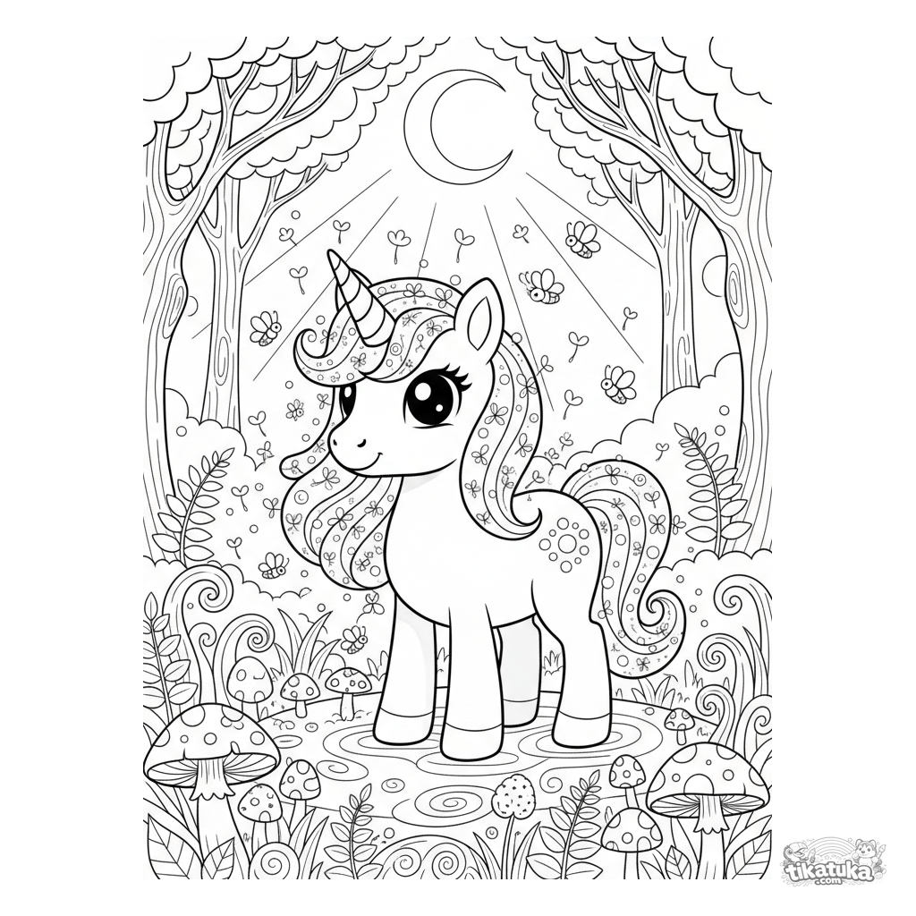 Hard coloring page for girls 7-12. A magical unicorn pony with a glowing mane of dandelion seeds in a moonlit forest glade.