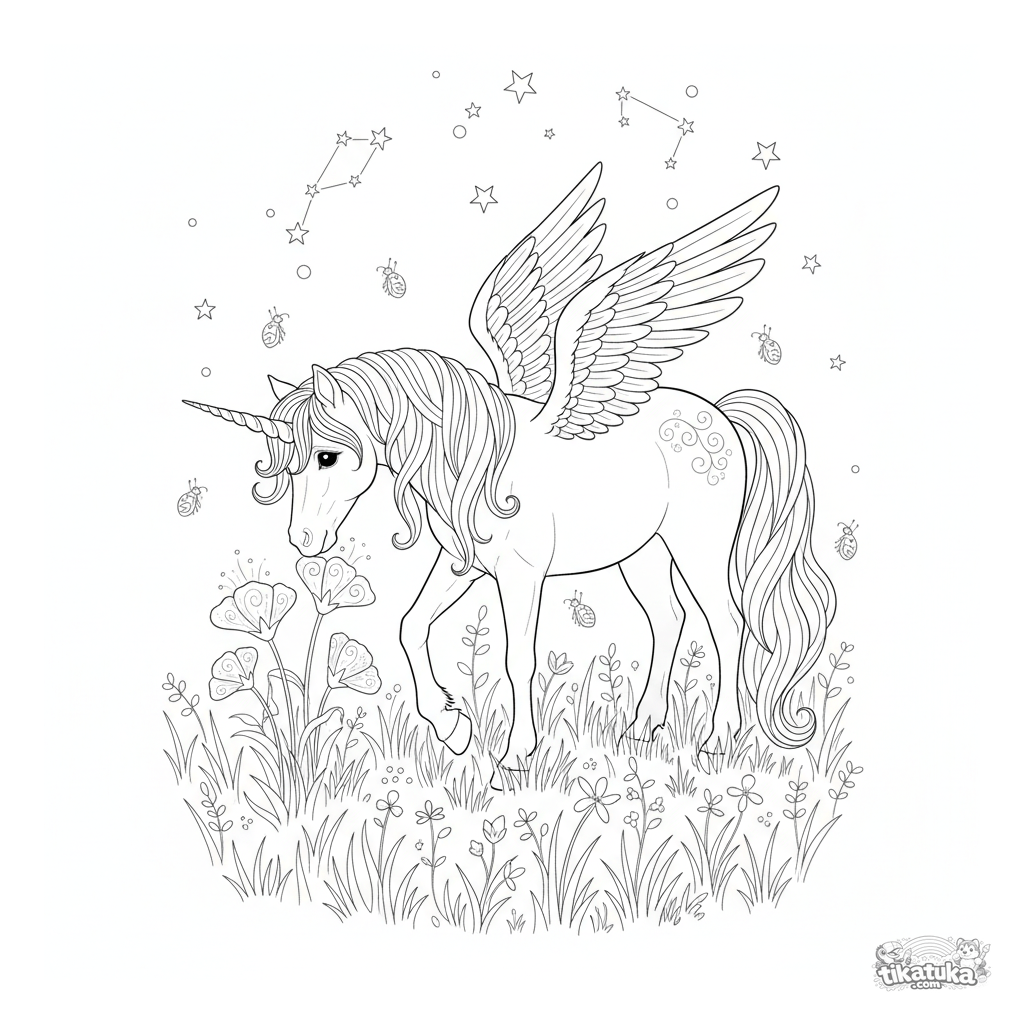 Detailed coloring page of a winged unicorn grazing in a moonlit meadow. For kids 8-12. Intricate scene with moonflowers, stars, and fireflies.
