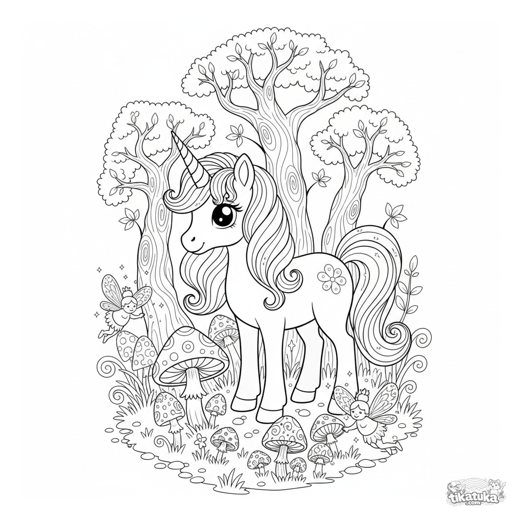 Coloring page of a graceful unicorn pony grazing among glowing mushrooms in an enchanted forest. For kids aged 5-8. Magical atmosphere and details.