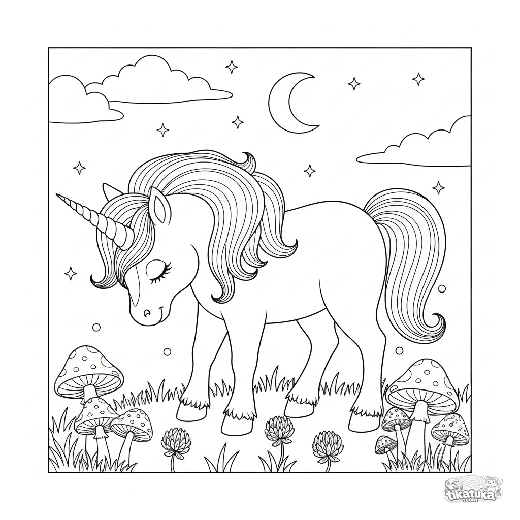 Intricate coloring page of a magical unicorn grazing in a moonlit meadow. For kids aged 8-12. Lots of small details and magical elements.