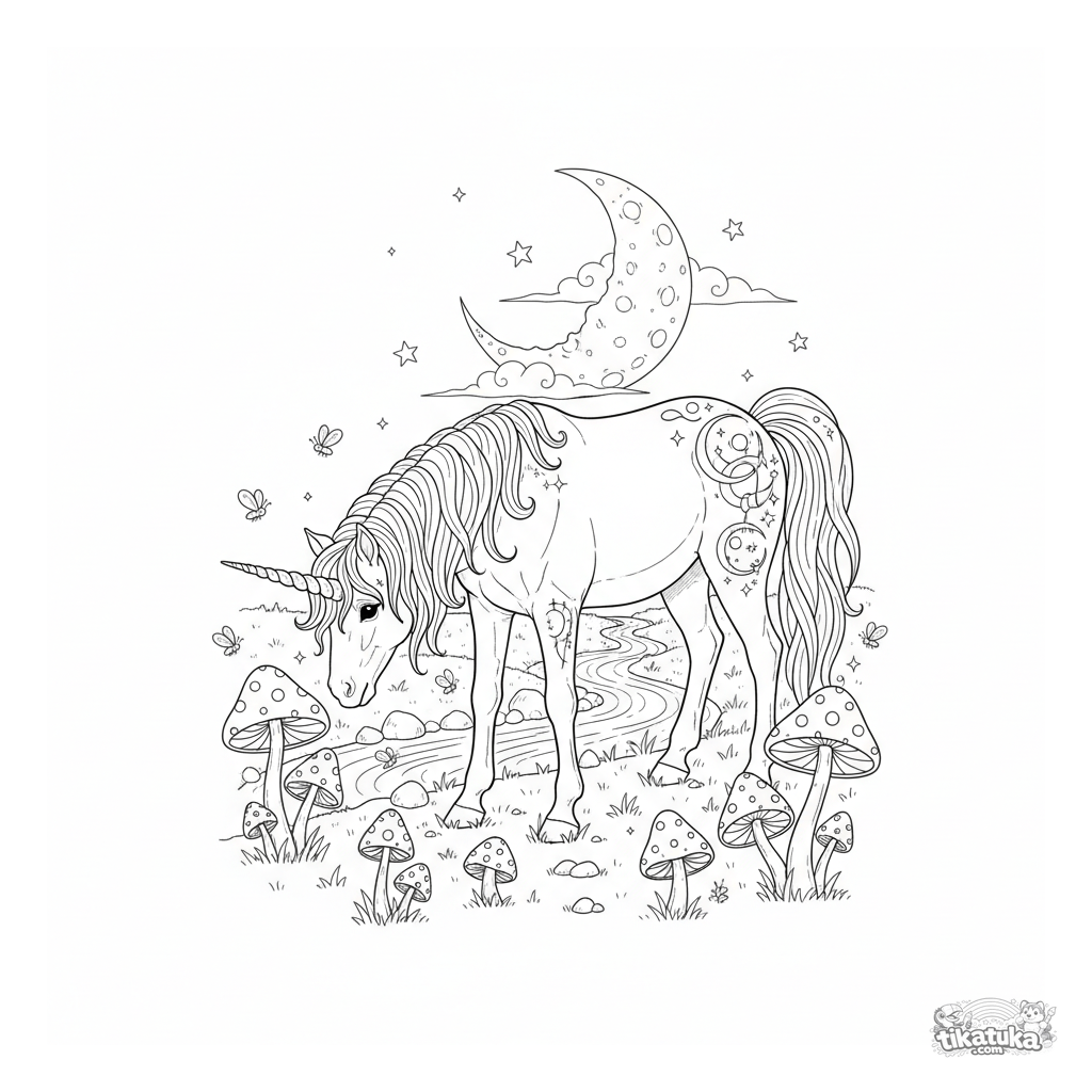 Coloring page of a realistic unicorn pony grazing in a moonlit meadow with glowing mushrooms. For kids aged 8+. Challenging level.