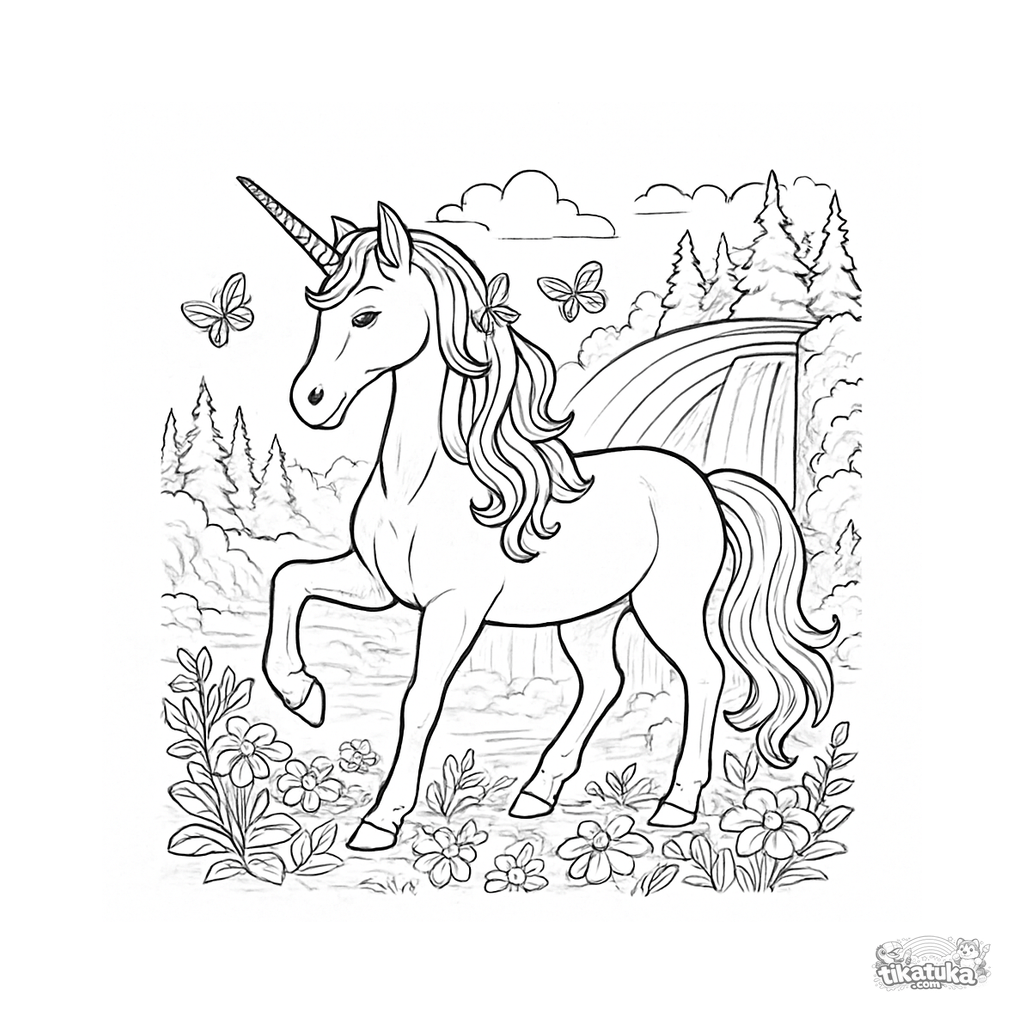 Coloring page for children 8-12 years. White unicorn with shimmering horn by rainbow waterfall, butterflies around mane, wildflowers at hooves. Free download.
