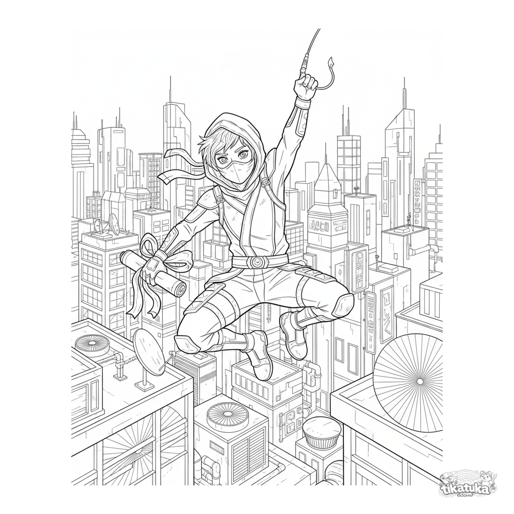 Action anime coloring page: a ninja apprentice makes a rooftop leap in a neon city. Dynamic composition with a detailed background for kids 10-12.