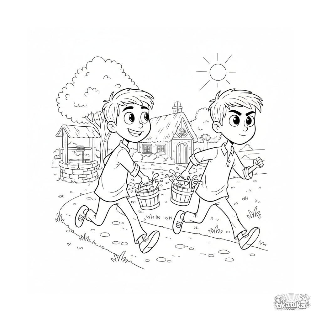 Coloring page for kids 4-6: two village boys playfully race while carrying buckets of living water from the well. Dynamic scene in a 90s cartoon style.