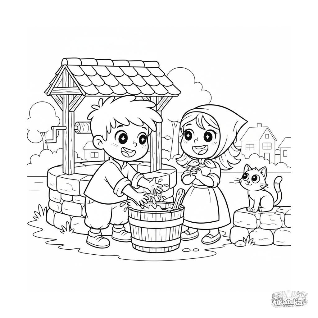 Coloring page for kids 7-9: cheerful village children play by the well of living water, one splashing from the bucket. Lively scene with a cat and a wooden dipper.