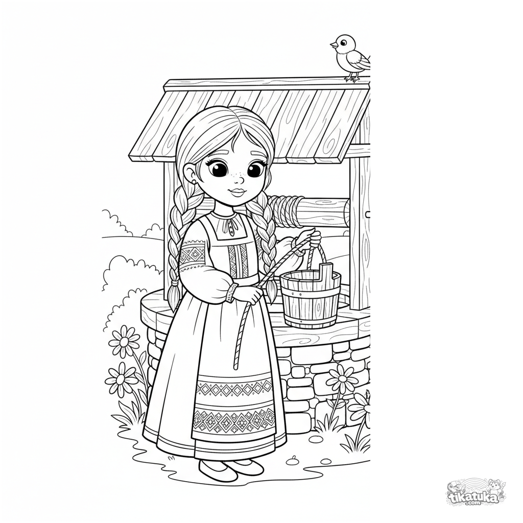 Coloring page for kids 4-6: a girl in folk costume draws water from a wooden well of living water. Peaceful village scene with flowers and a bird.