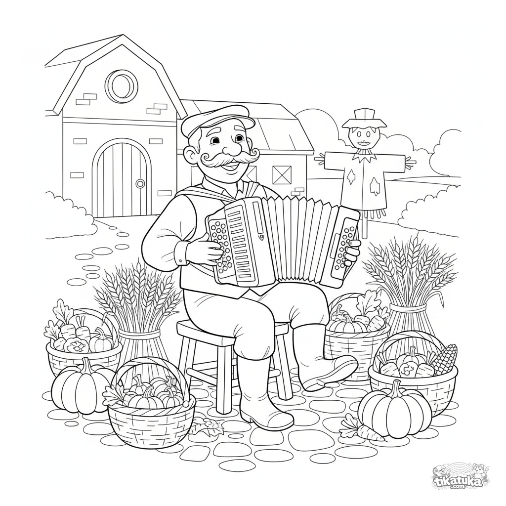Kids coloring page: a cheerful village musician plays an accordion in a yard during the harvest. Free printable page, suitable for ages 4-6.
