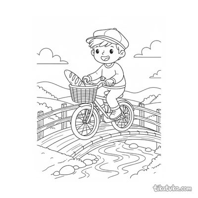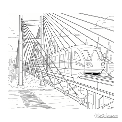 Detailed coloring page of a steam locomotive. For kids 8-12 years old. The detailed train crosses a stone bridge over a gorge, the engineer waves from the cab. High level of detail.