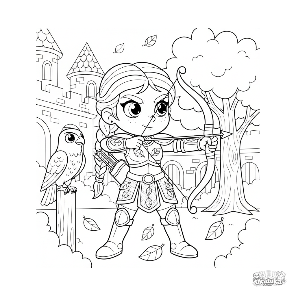 Coloring page for kids 7-9: a warrior princess in leather armor practices archery in an autumn castle courtyard, with a hawk companion nearby.