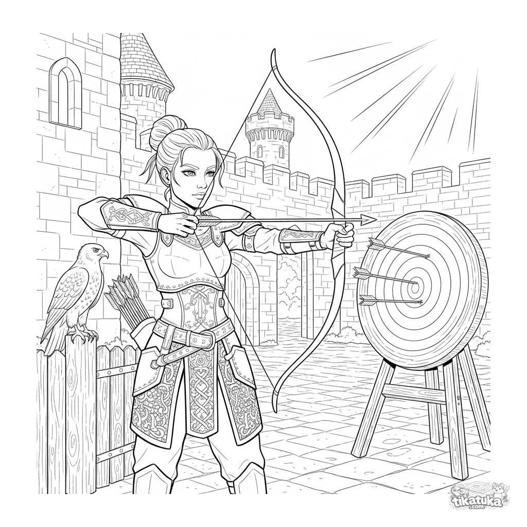 Detailed coloring page for kids 10-12: a warrior princess in armour aims a bow at a straw target in a castle courtyard, a hawk nearby.