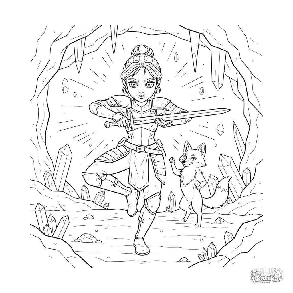 Coloring page for tweens 7-9: a warrior princess training with a practice sword in a glowing crystal cave. A fox companion poses beside her.