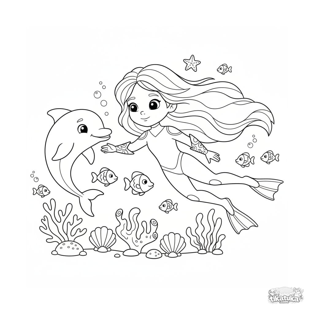Coloring page for tweens 7-9: a water hero in a blue suit explores a colorful coral reef with a friendly dolphin companion.