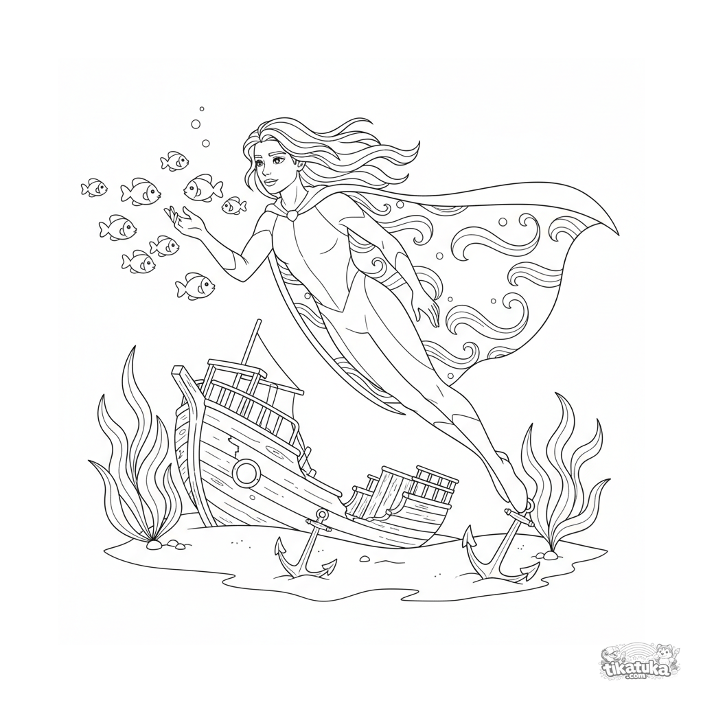 Coloring page for tweens 7-9: a water-powered superhero swims through a coral reef near a sunken ship, interacting with fish. A peaceful underwater exploration scene.