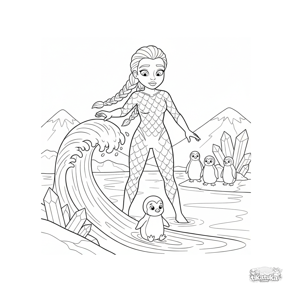 Coloring page of a water superhero helping a penguin chick on a frozen lake. For kids 4-6. Cute rescue scene in a snowy landscape.