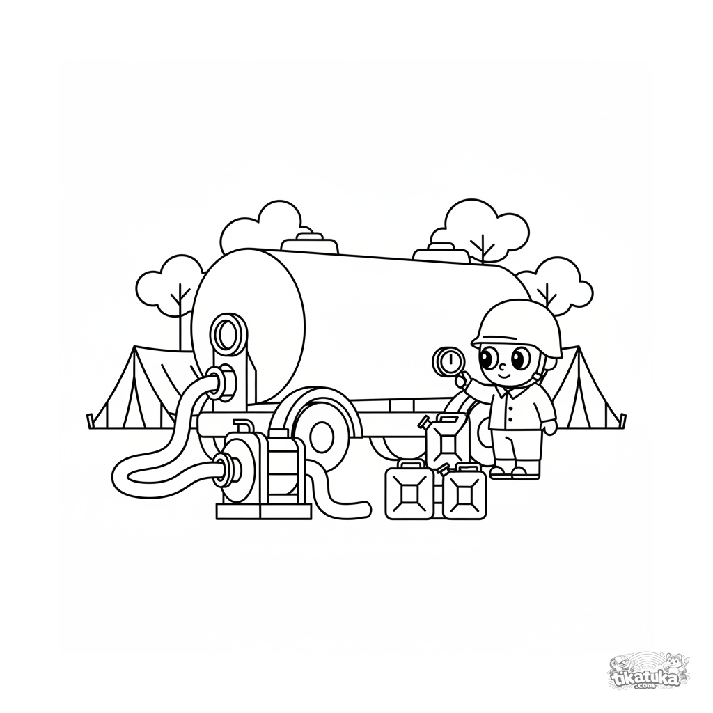 Coloring page for kids 4-6: a large water tanker truck is being refilled from a pump near field headquarters tents.