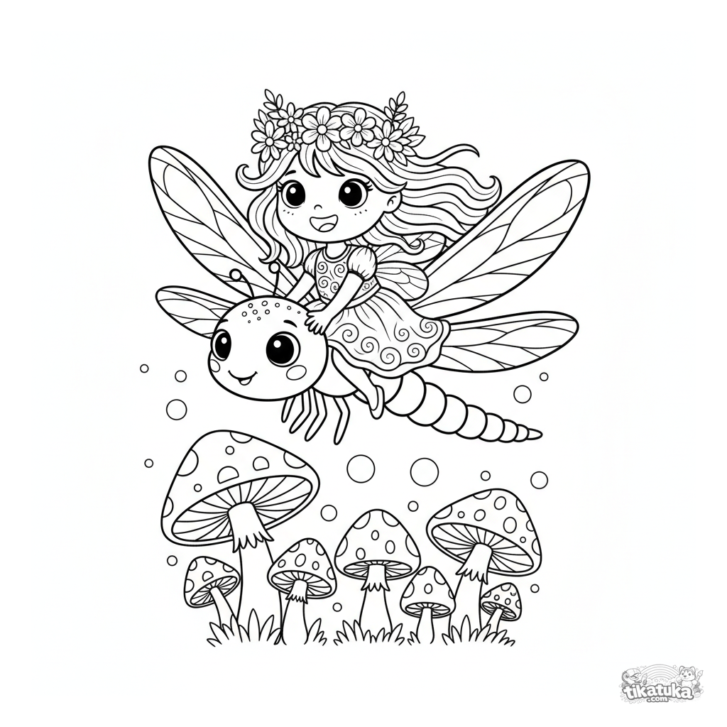 Coloring page for girls 4-6: a whimsical fairy rides a giant dragonfly over a mushroom forest. Encourages imagination and color recognition.