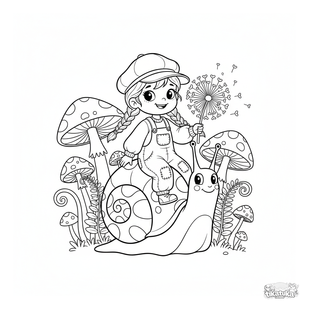 Coloring page for girls: a cheerful girl in patchwork overalls rides a giant snail through a magical mushroom forest. For kids 5-8 years old.