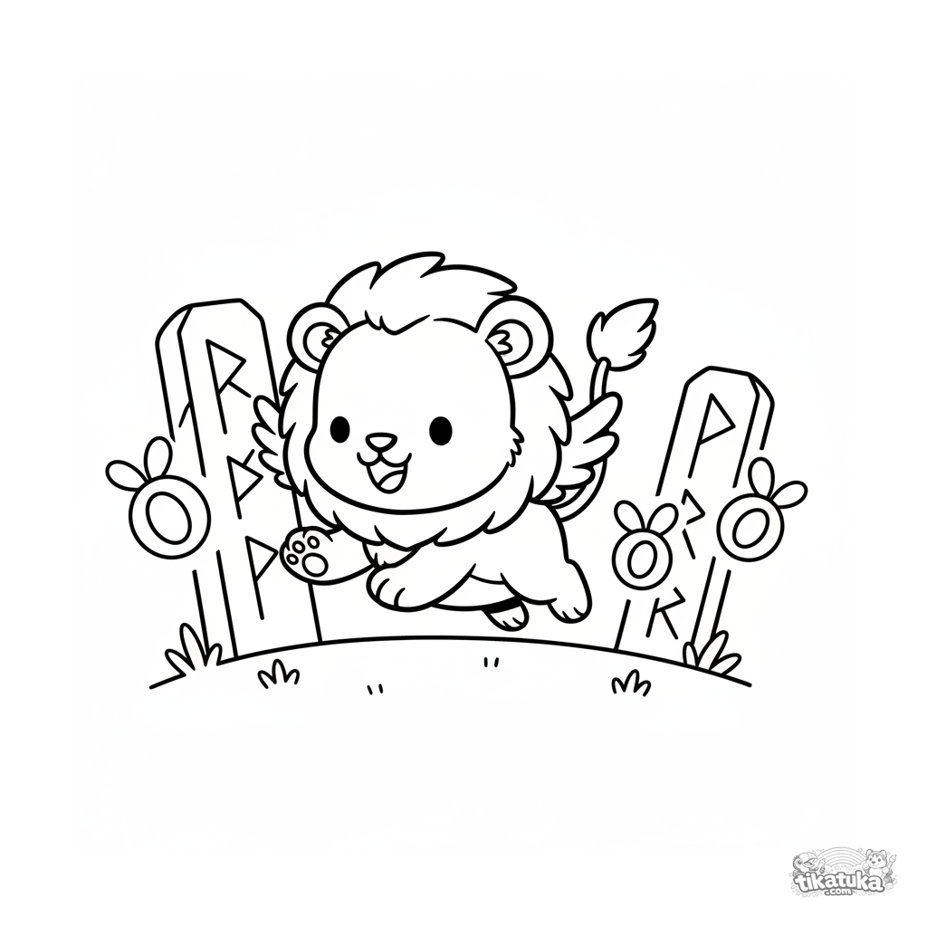 Toddler coloring page: a fluffy winged lion cub jumps happily after fireflies among ancient rune stones at dusk. Very simple, large shapes with wide margins.