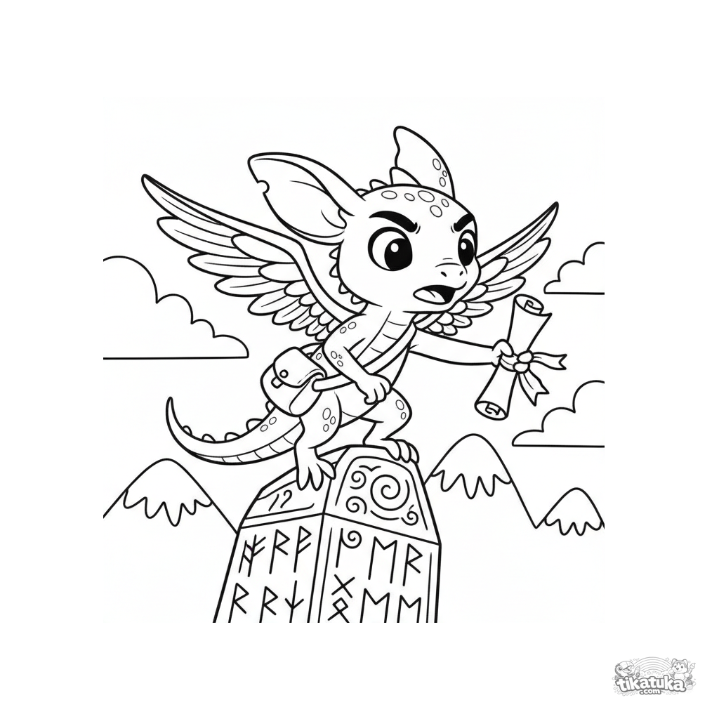 Coloring page for tweens 7-9: a winged lizard messenger with an urgent look delivers a scroll to a runed monolith. Dynamic pose, shoulder satchel, clear outlines.
